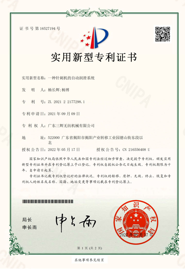2012 Third Prize of Guangdong Science and Technology Award (Wide working width high frequency velour needle punching machine)